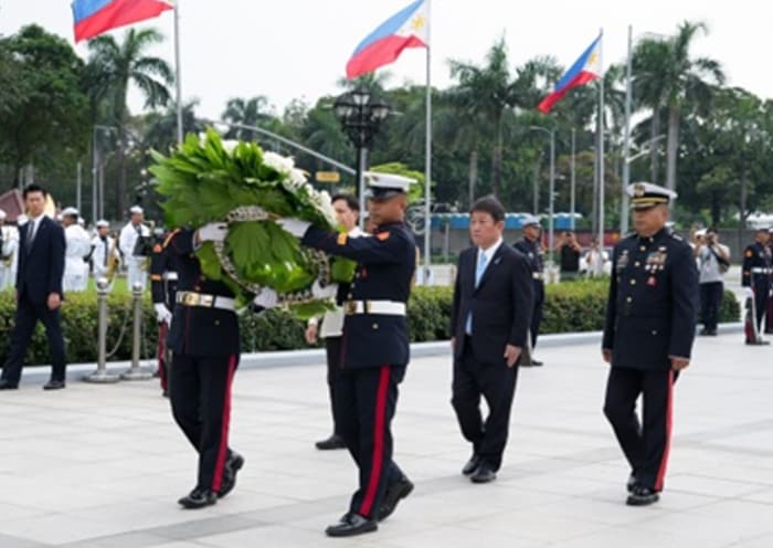 リサール公園での献花式にのぞむ茂木外相=15日付日本大使館プレスリリース