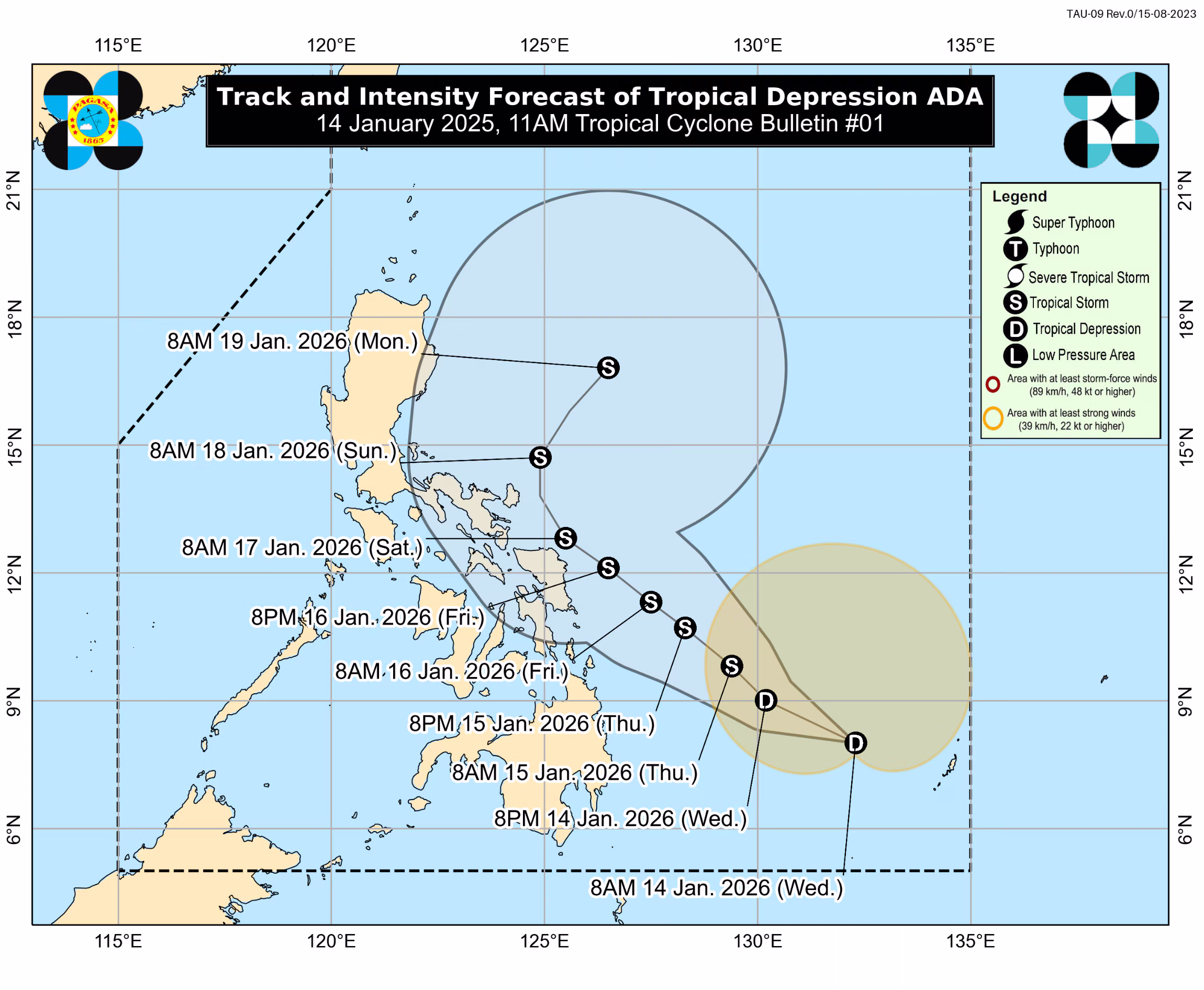 フィリピン気象庁の14日午前11時発表によると、ミンダナオ島東方沖合にあった低気圧が熱帯低気圧(比名アダ)に発達した。また、日本の気象庁の14日正午発表によると、この熱帯低気圧は24時間以内に台風に変わる見通しで、今年初の台風1号となる。