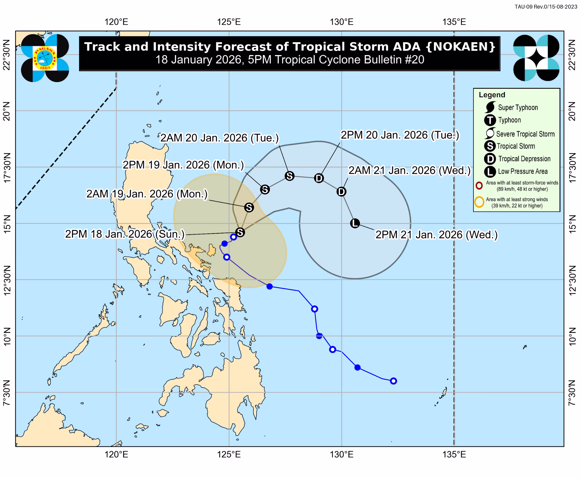 18日午後5時現在の比気象庁発表によると、台風アダの中心はビコール地域カタンドゥアネス州ビラック町の北東205キロの海上にあり、北東に向かってゆっくりと進んでいる。中心付近の最大風速は18メートル、最大瞬間風速は22.2メートル。